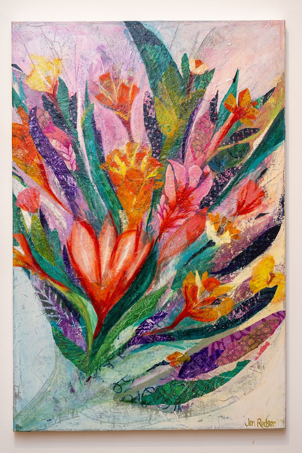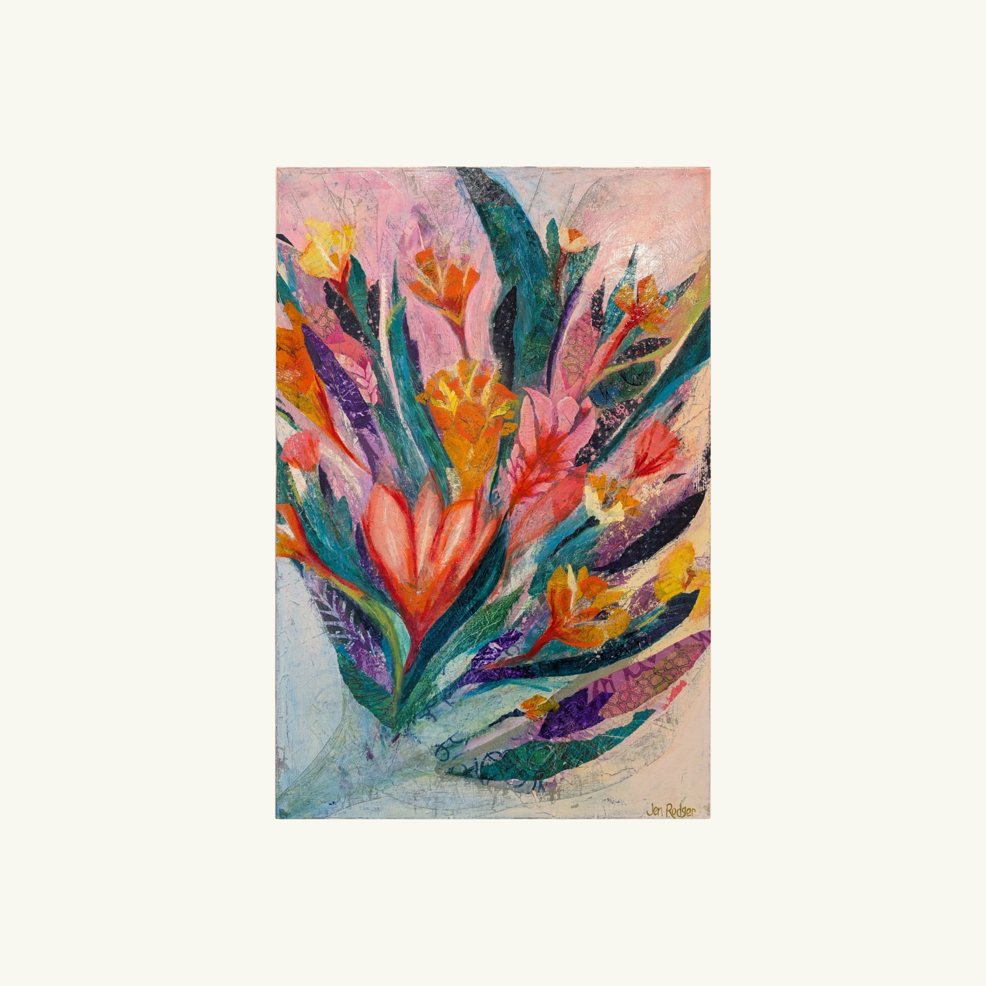like a fantastical bouquet unfurling in brilliant light. Sweeping gestures and expansive strokes converge into a celebration of inner wildness, unfettered and alive.