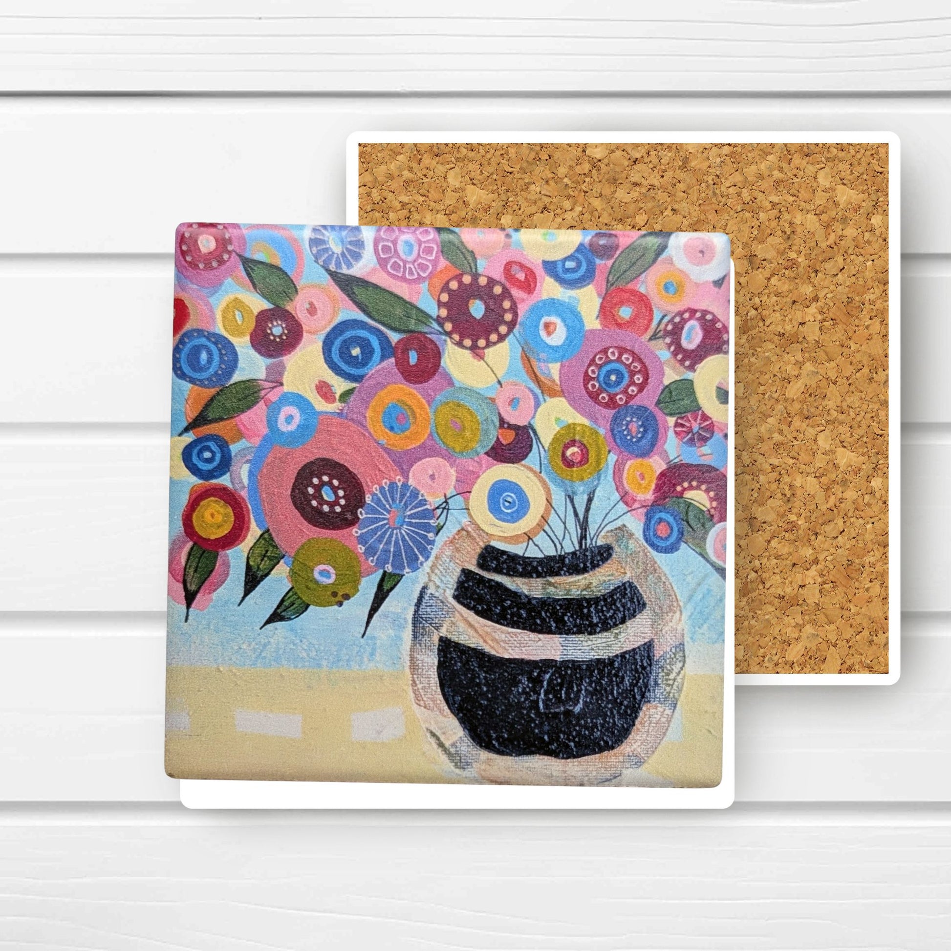 Brighten your table with this set of four ceramic coasters, each featuring one of my original artworks from the Blue Floral series. Made from durable 8mm ceramic with a protective cork backing, they’re heat and water-resistant for everyday use. Perfect for gifting or adding a colorful touch to your table or desk.