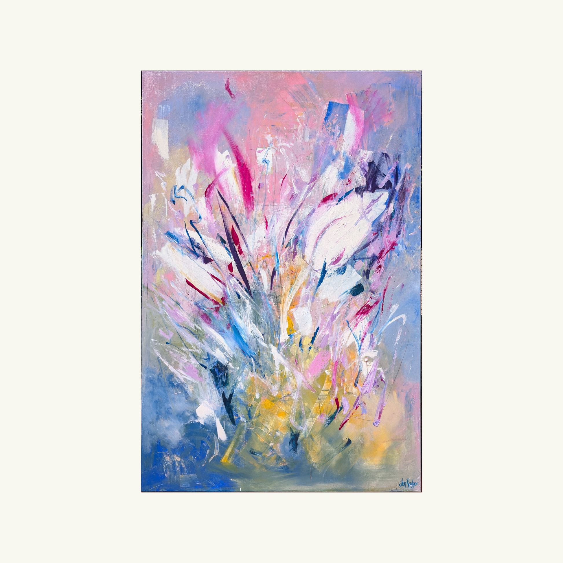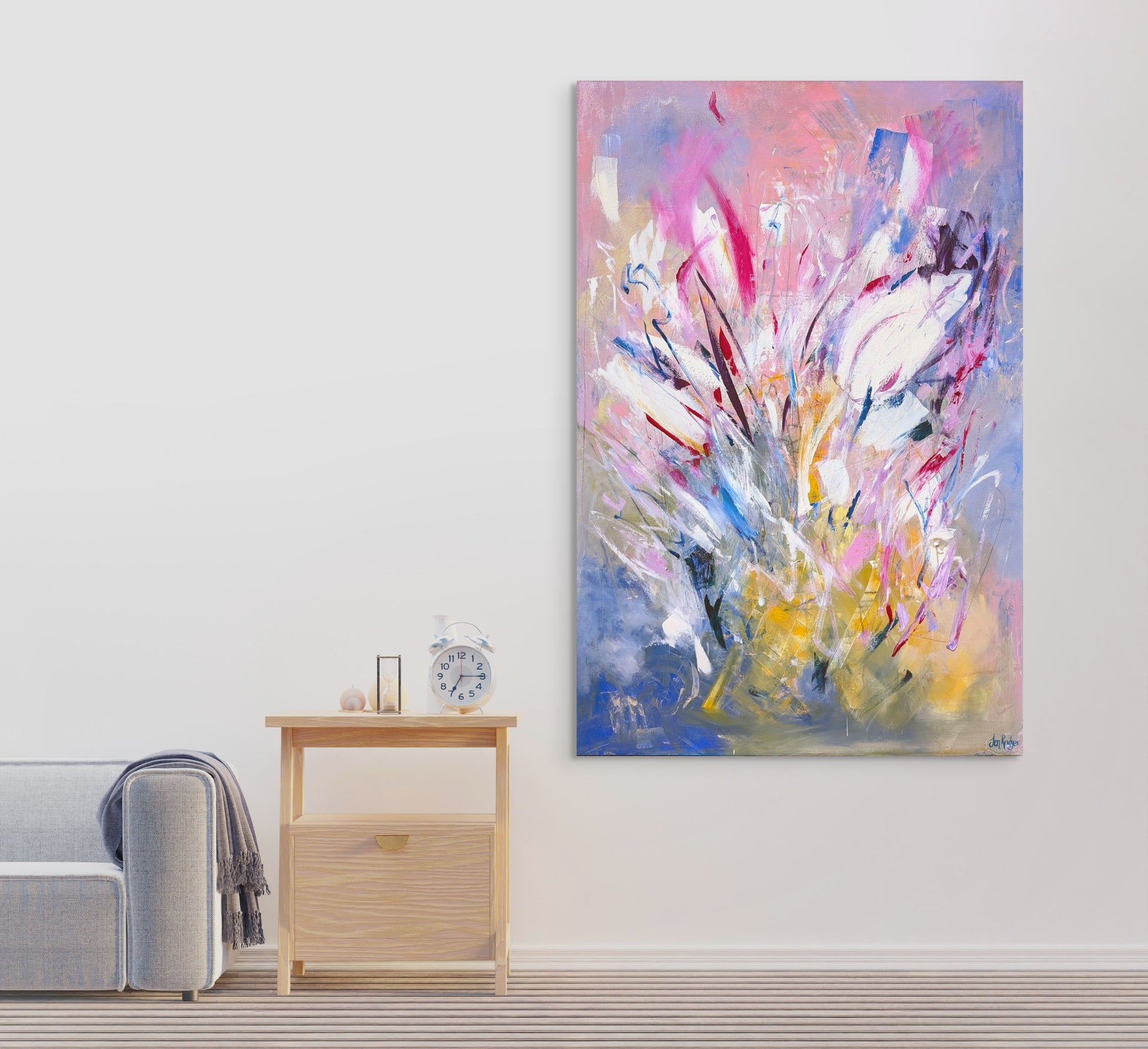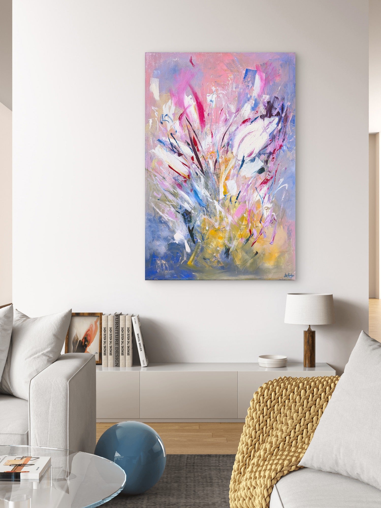 Make a vibrant statement with "Wild Abandon," a large-scale painting that is pure, uninhibited joy on canvas. This piece is a powerful celebration of freedom and the exhilaration of truly letting go. With its bold, energetic strokes of white, pink, yellow, and blue, it feels like a beautiful explosion of emotion and unbridled creativity. The large size (101cm x 152cm) allows this wild energy to completely transform a room, creating a focal point that is both breathtaking and full of life. "Wild Abandon" is an invitation to embrace the chaos and find beauty in the spontaneous, making it a perfect piece for anyone who wants to bring a sense of fearless, happy energy into their home