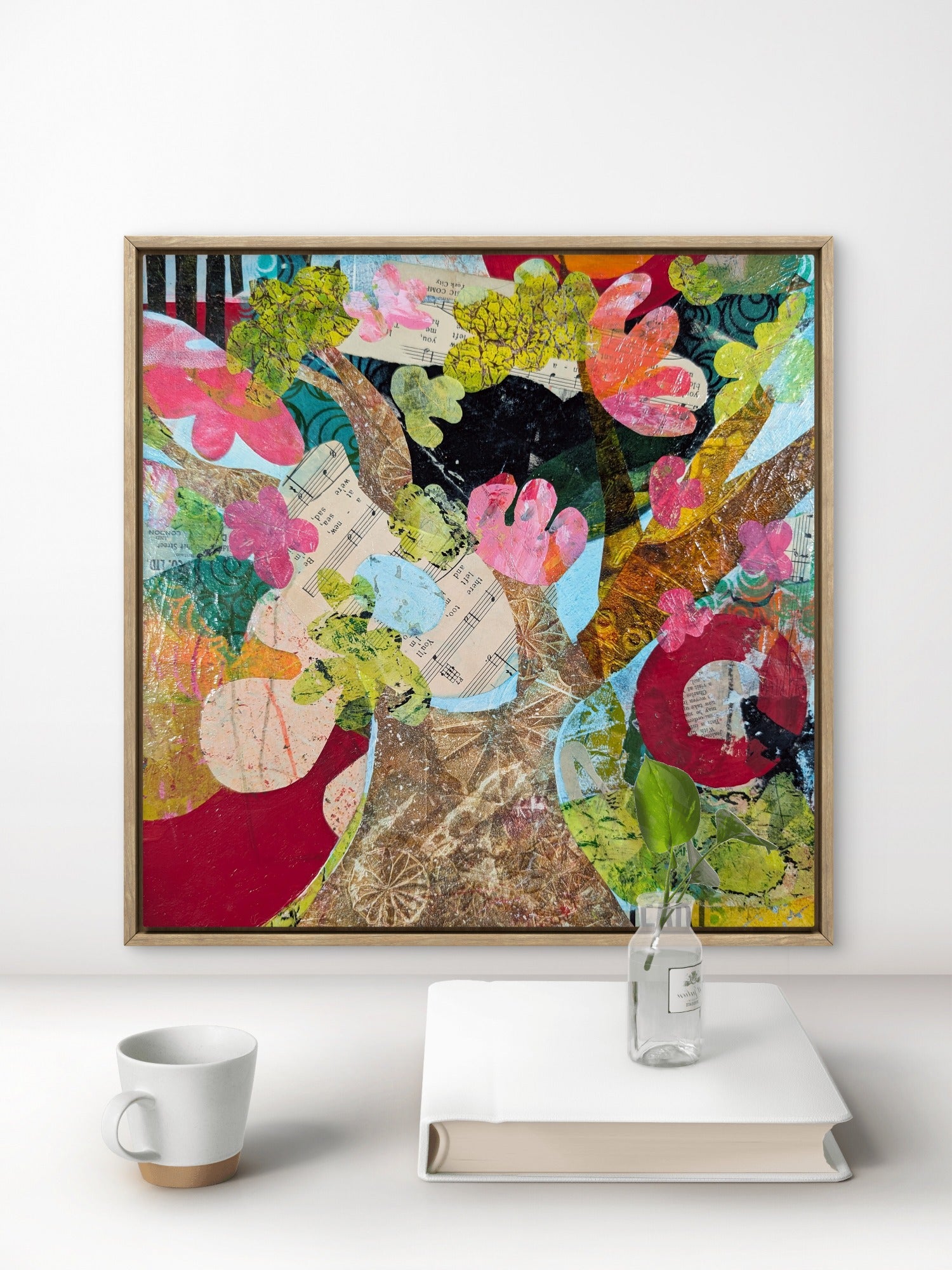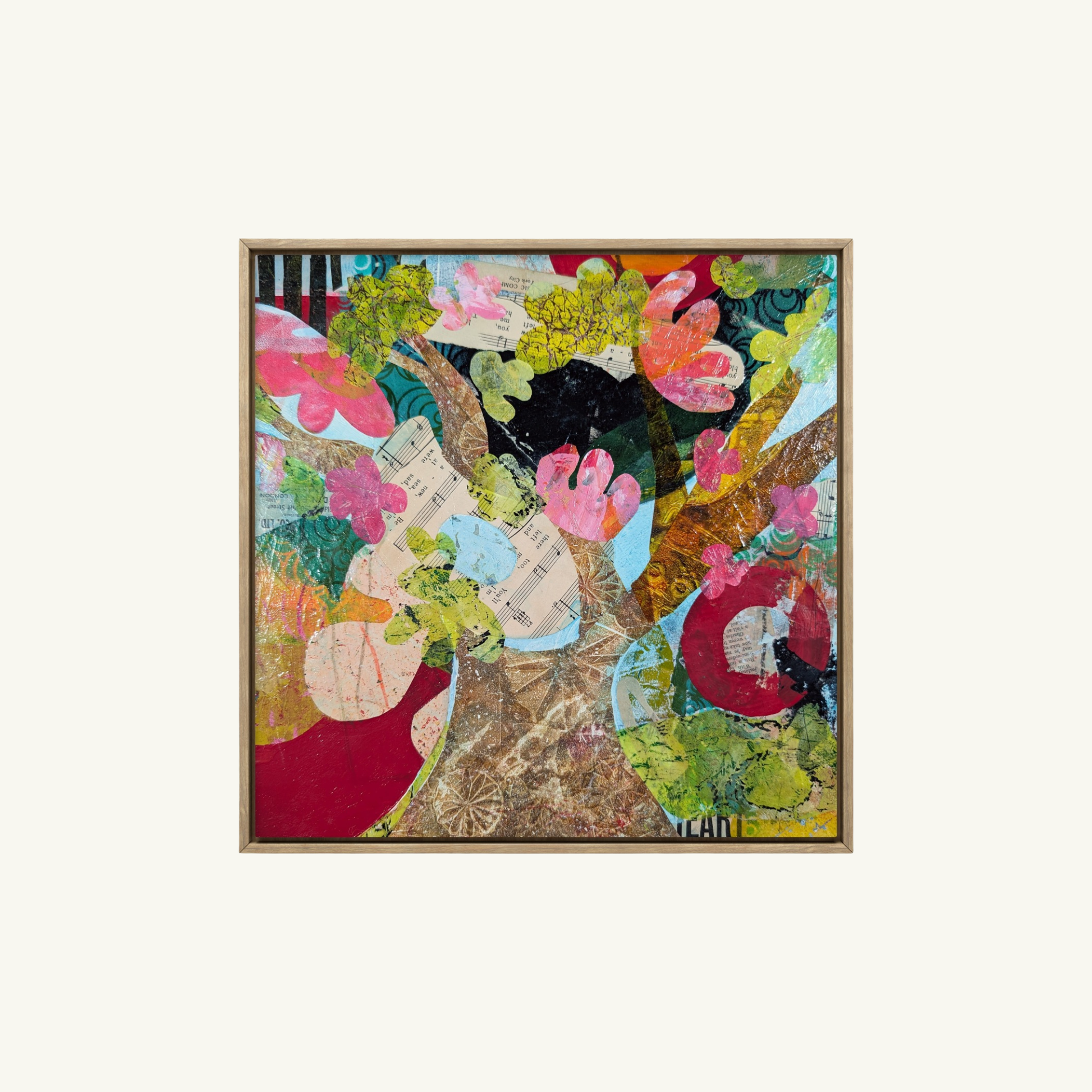 "The Faraway Tree" invites a realm of playful enchantment where the magic of nature intertwines with layers of memory and story. Vibrant foliage and textural bark reach upwards, adorned with abstract blooms in joyful pinks, oranges and yellows. Collaged fragments of sheet music whisper of melodies and forgotten tales - a nostalgic call to let go of the mundane and embrace the fantastical journeys hidden within the natural world.
