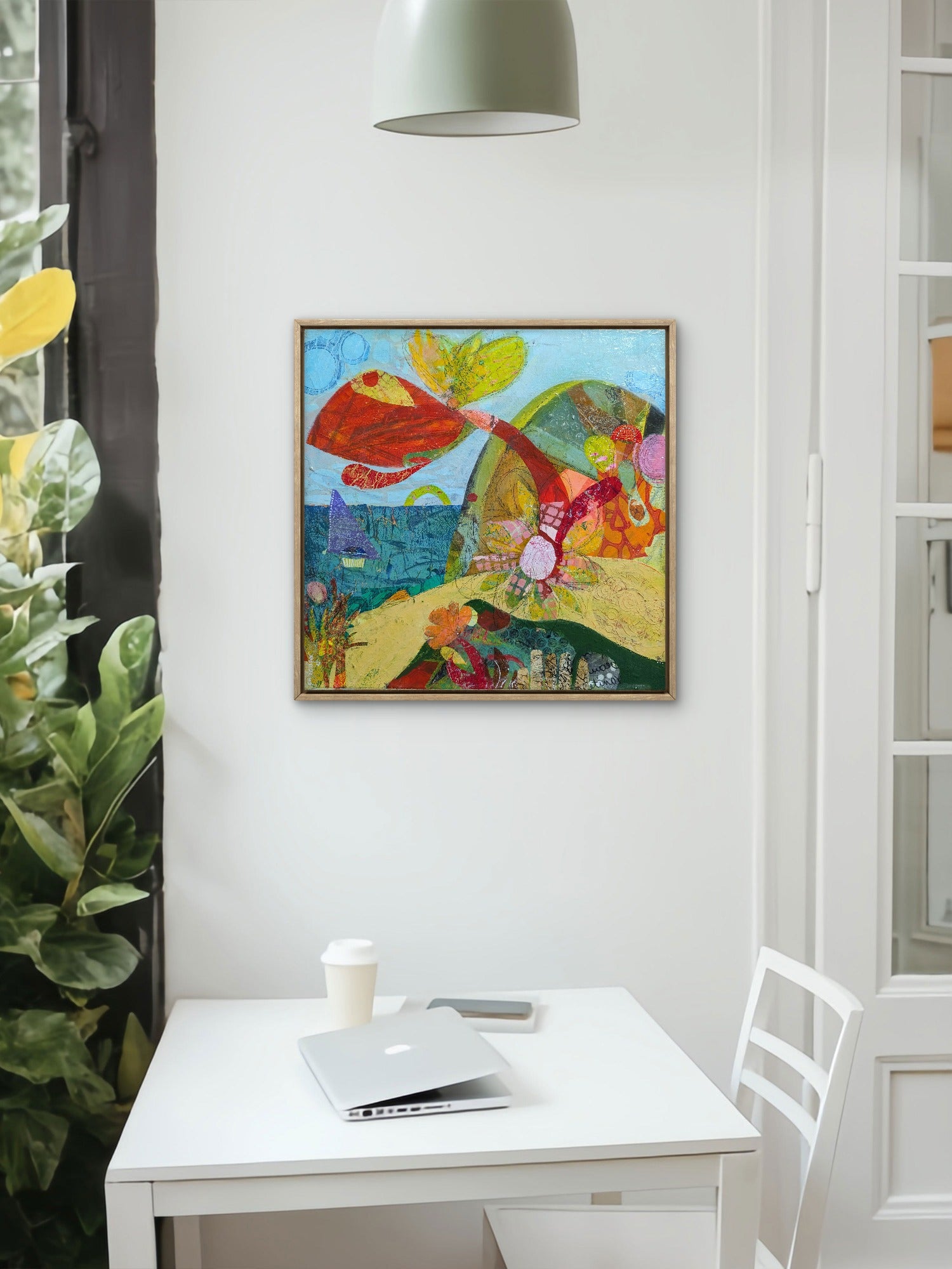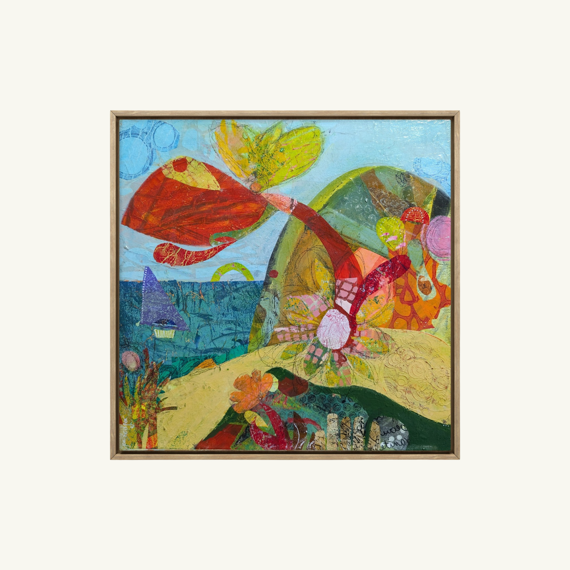 It's a celebration of a free spirit enjoying a beautiful day by the sea, filled with bright reds, sunny yellows, and refreshing blues. With its intricate collage details and expressive shapes, this painting invites you to feel the warmth of the sun and the gentle breeze of the beach. It’s a perfect piece to bring a relaxed, happy, and lighthearted energy into any room.