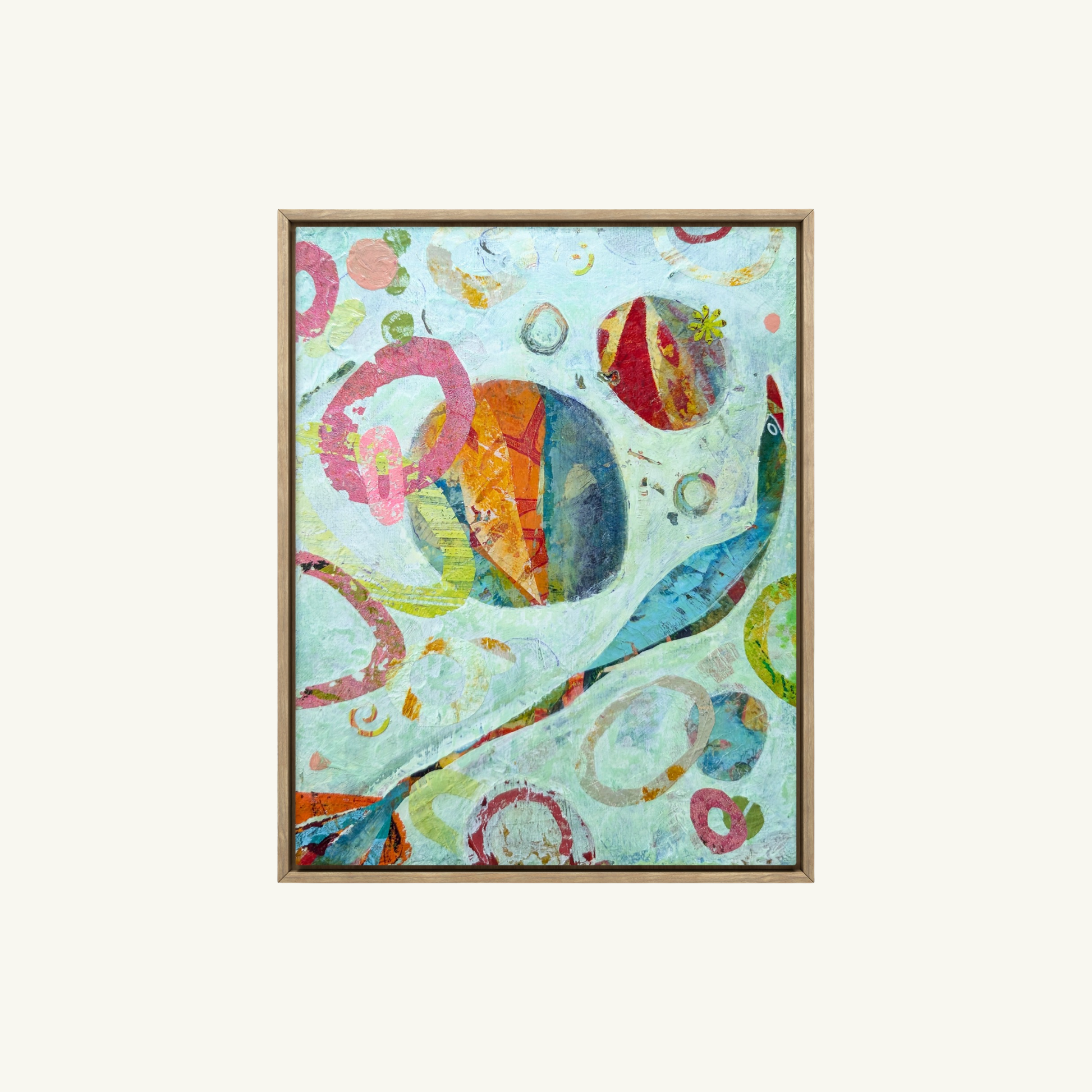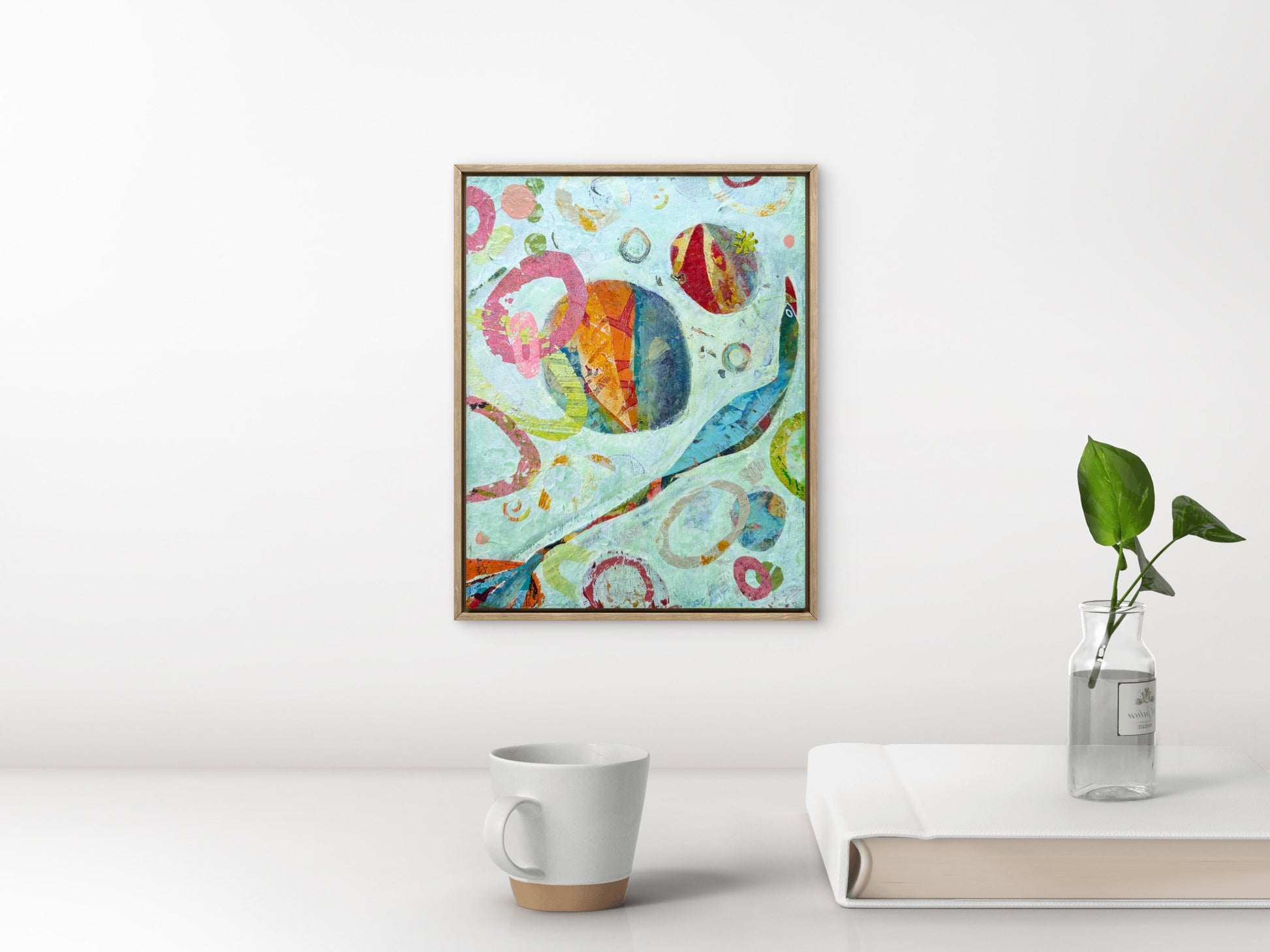 Let your spirit soar with "Sky Dancer," a joyful and whimsical painting that will bring a burst of happy energy to your space! This delightful piece features a charming, bird-like figure dancing through a colourful sky filled with playful shapes and vibrant hues of blue, orange, pink, and yellow. It's like a little dose of pure happiness captured on canvas, reminding you to embrace freedom and move through life with a light heart. Hang "Sky Dancer" in your home and let its joyful energy uplift your everyday!